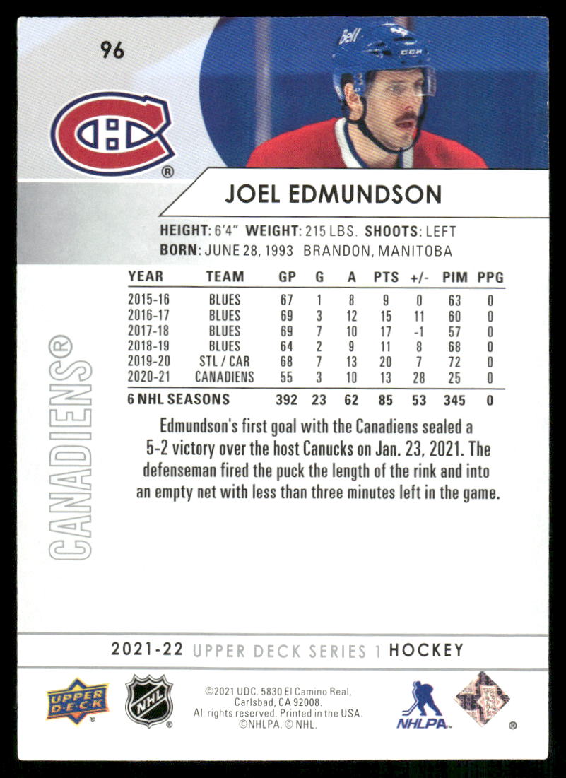 هذا مثال جيد لـ 2021-22 Upper Deck #96 Joel Edmundson