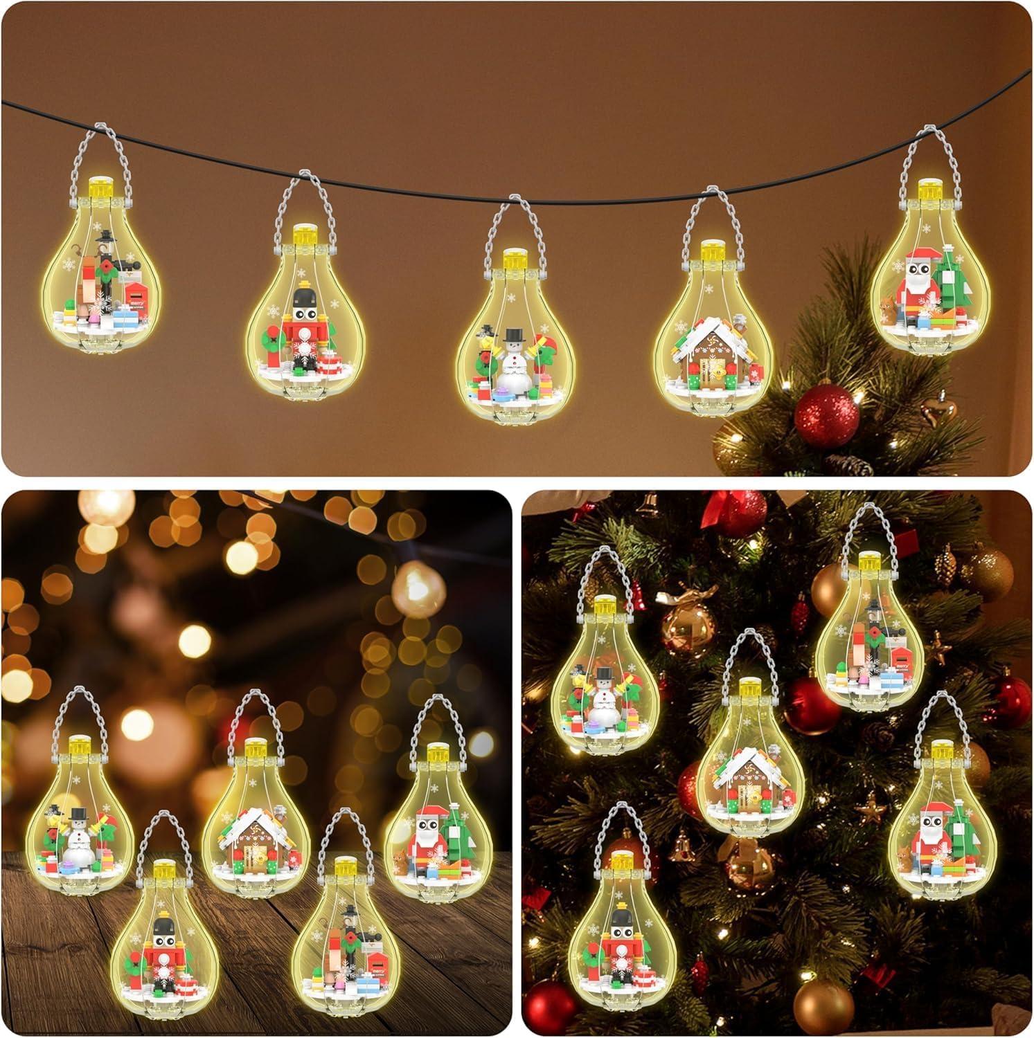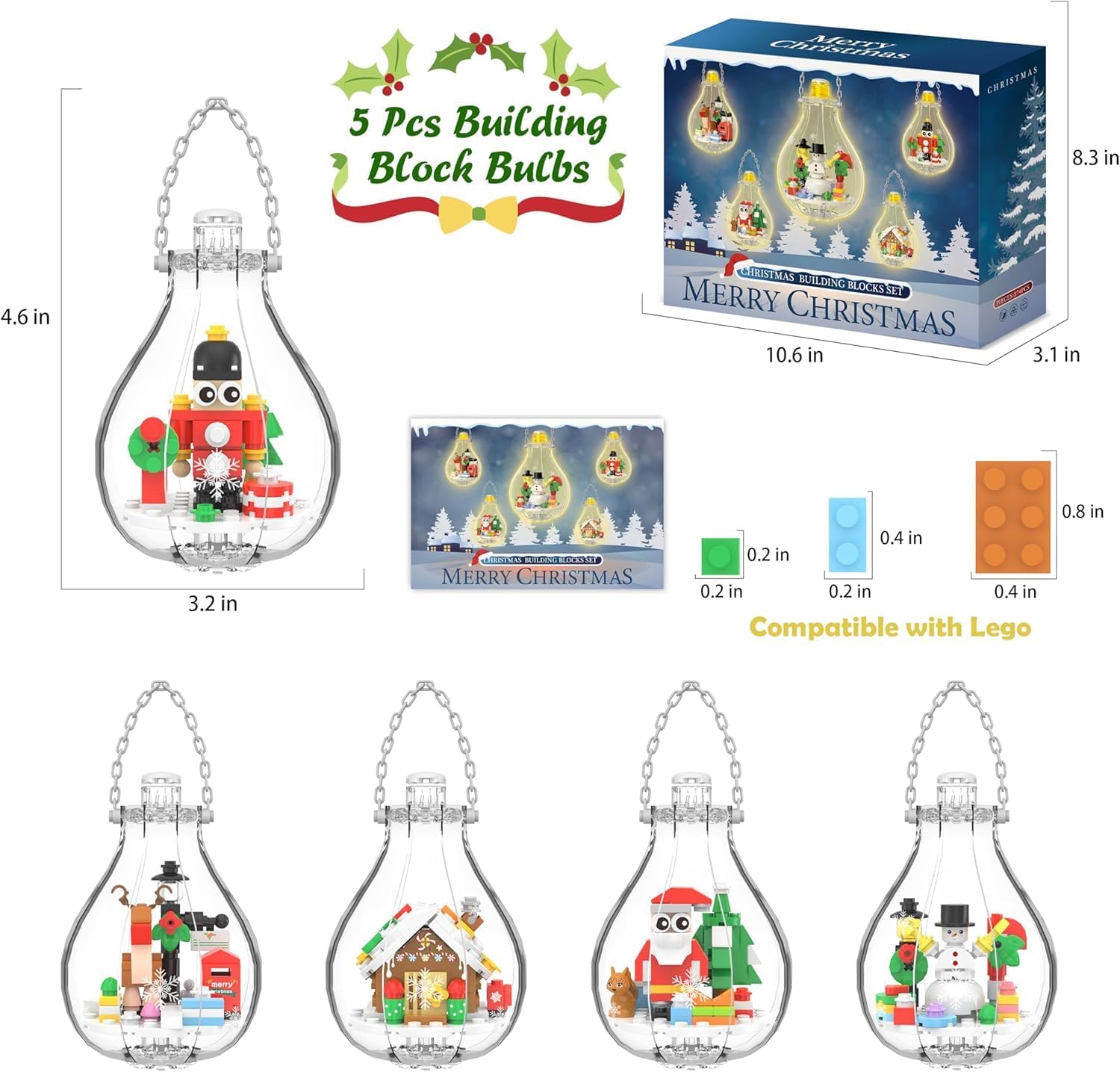 Christmas Ornaments Building Blocks, Christmas Tree Decorations Bulbs, Reindeer, Nutcrackers, Gingerbread House, Snowman, Santa 5 Pack