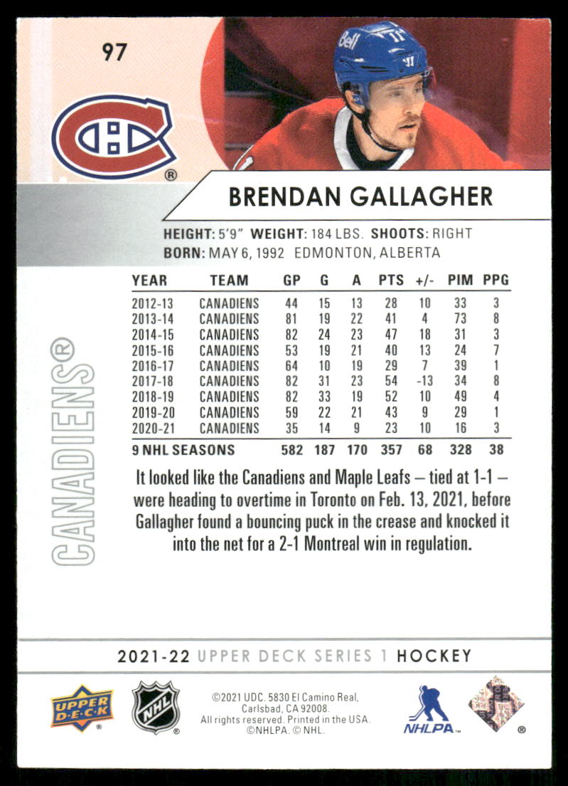 This is a nice example of a 2021-22 Upper Deck #97 Brendan Gallagher