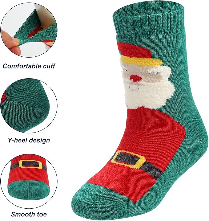 Keep little feet cozy all winter long with this premium three-pair sock set designed for active kids. Crafted from soft cotton with an ultra-thick construction, these crew-length socks provide superior warmth and cushioning for everyday wear and cold-weather adventures. The festive Christmas designs appeal to both boys and girls, making them perfect for holiday gifting or seasonal rotation. Durable and easy to care for, this bundle offers excellent value for parents seeking reliable winter essentials that withstand frequent washing and active play.