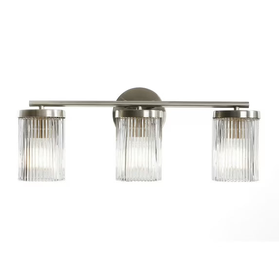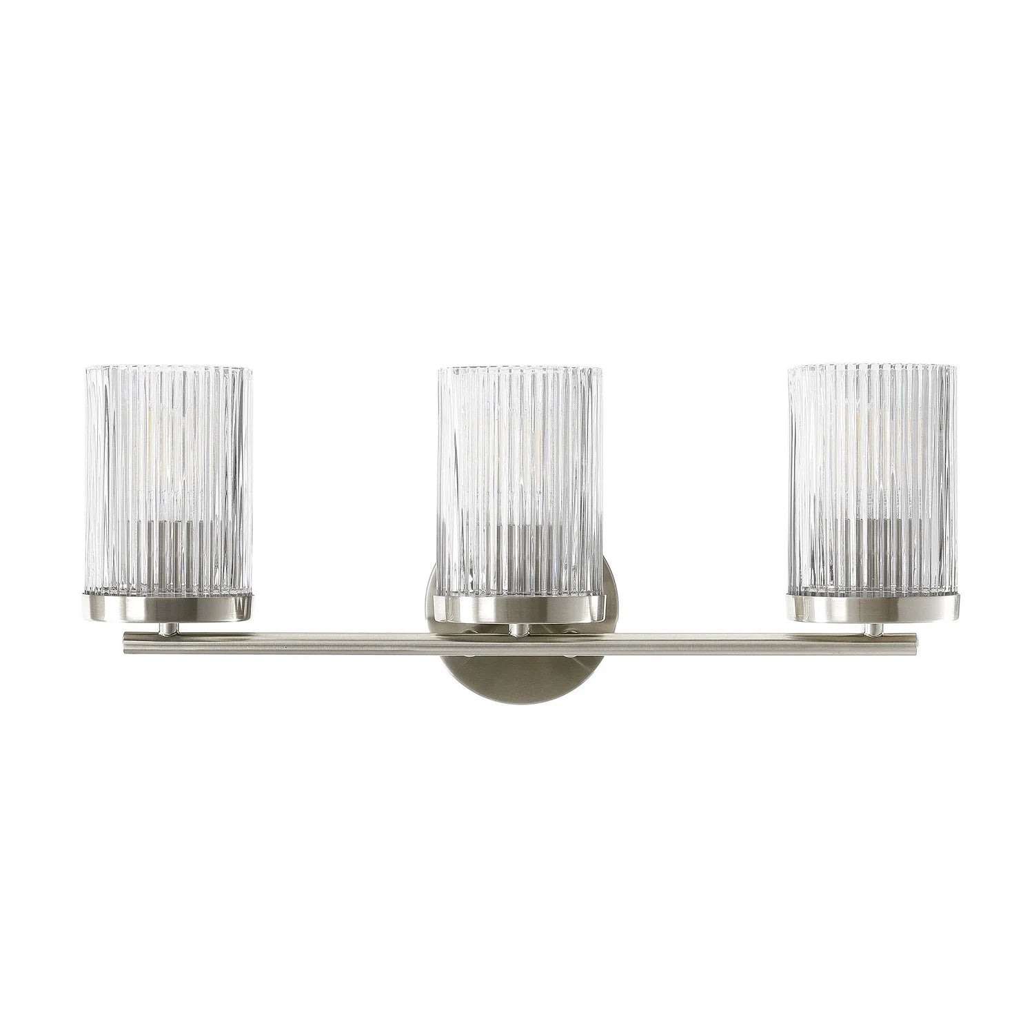 - Three Clear Ribbed Glass Shades: Each cylindrical shade features vertically textured glass that diffuses light beautifully for a soft, radiant glow