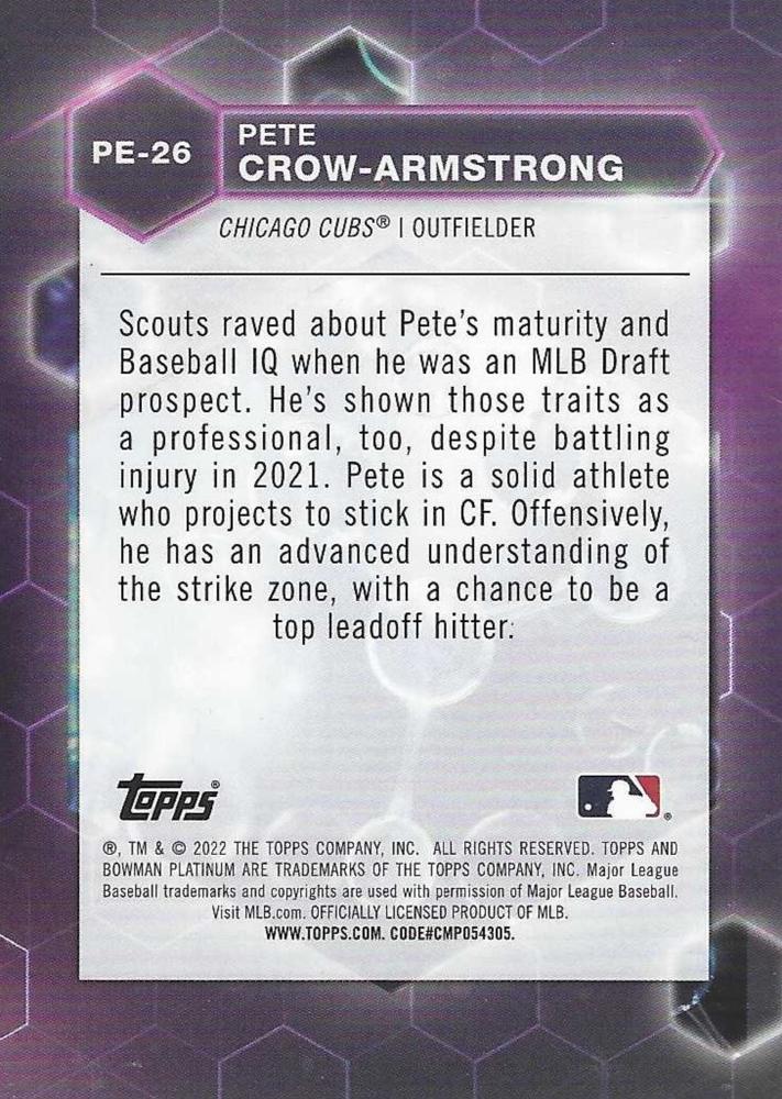 Experience the thrill of owning 2022 Bowman Platinum Precious Elements Pete Crow-Armstrong PE-26 Chicago Cubs! This dazzling piece of memorabilia is sure to invigorate Cubs fans and collectors alike. Own a piece of history and show your love for the Cubs today!