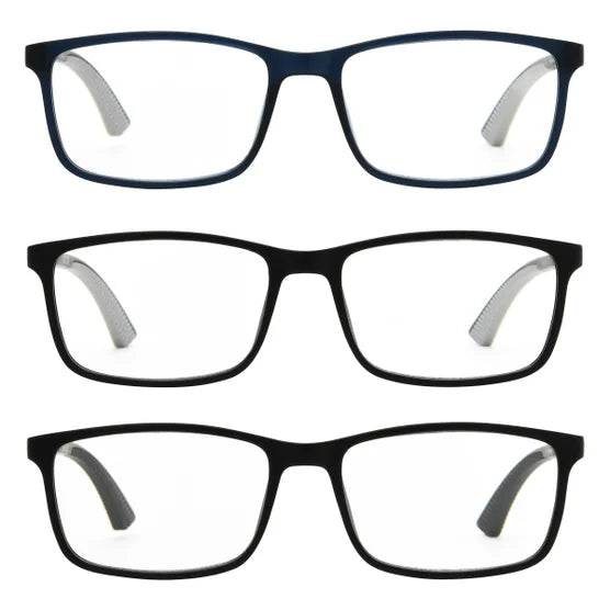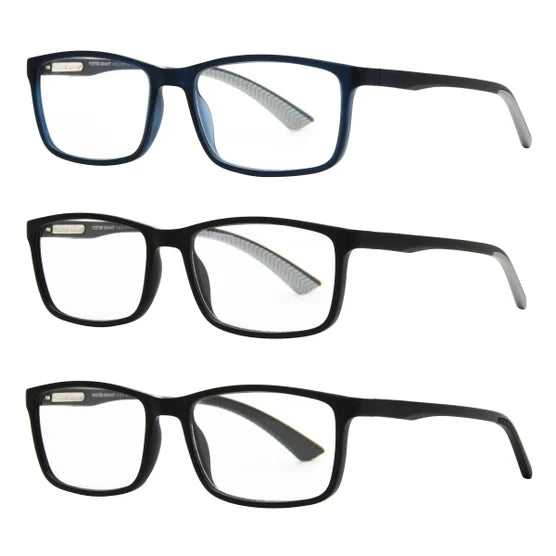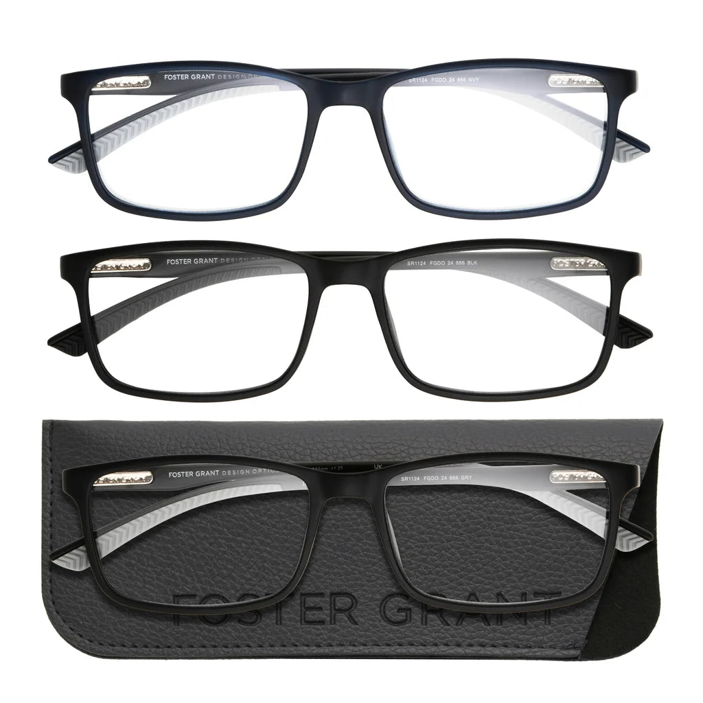 These high quality reading glasses feature frames made with 75% recycled plastic* and 100% recycled plastic lenses that are fully magnified, impact-resistant and 2x more scratch resistant** for added durability. Hidden metal spring hinges and mastoid temple tips offer all-day comfort, while co-injected rubber details provide a secure grip. Distortion Minimizing Lenses** Effective visibility area is increased compared to transitional spherical lens design.Includes a recycled polyester pebble grain leatherette case.*Recycled content is calculated by mass balance.**Results from steel wool testing versus prior iterations of Design Optics 3-pack readers. Independent lab certified.Features: