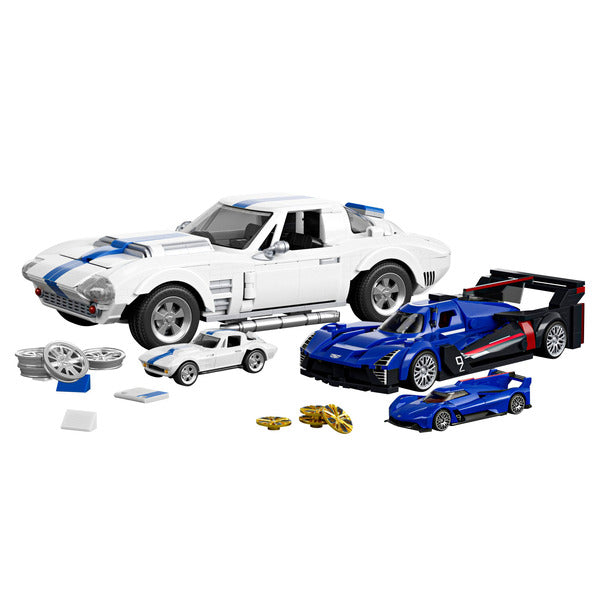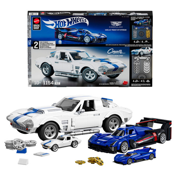 Each Car Includes a Custom Decal Sheet and 2 Sets of Wheel Covers; Includes 2 Metal Die-cast Cars; Cadillac GTP: 236 Total Pieces; Corvette: 918 Total Pieces; Recommended Age: 10+