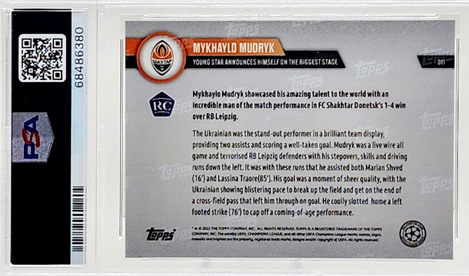 أكمل مجموعة بطاقات Topps Now UCL 2022-23 الخاصة بك بهذه البطاقة الرائعة Mykhaylo Mudryk Rookie RC PSA 10 Gem Mint! تتميز هذه البطاقة بميزات مذهلة وتوفر جودة ومتانة فائقة، وهي مصنفة على أعلى مستوى من PSA 10 Gem Mint. كل بطاقة هي اكتشاف فريد ونادر، ومن المؤكد أنها ستضيف الجمال والقيمة إلى مجموعتك!