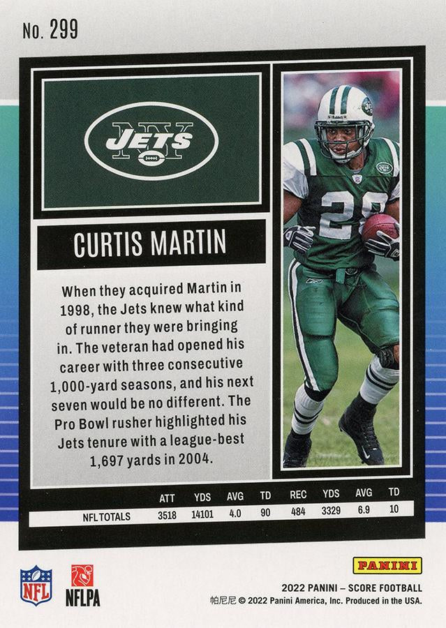 احصل على بطاقة Panini Score Base لعام 2022 من الأسطورة Curtis Martin رقم 299، والتي تمثل فريق New York Jets المحبوب لديه! احصل على هذه البطاقة النابضة بالحياة اليوم وأضف بعض التألق إلى مجموعتك!