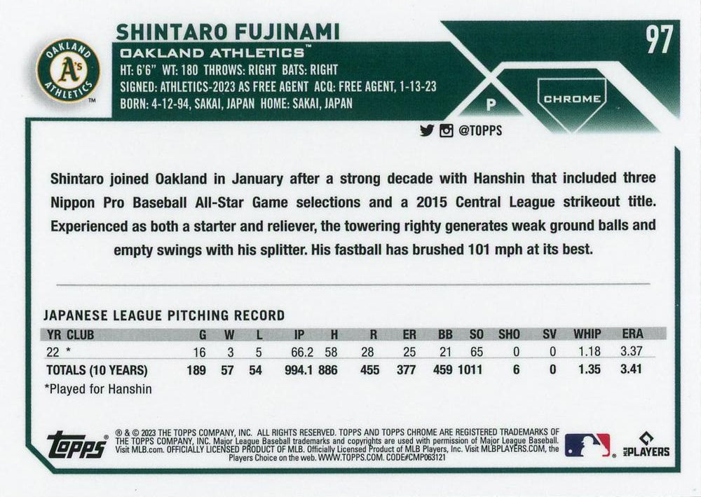 Experience the thrill of collecting the highly coveted 2023 Topps Chrome Shintaro Fujinami RC #97 Oakland Athletics card. Add this valuable piece to your collection and feel the excitement every time you see it. Don't miss out on this must-have for any passionate collector!