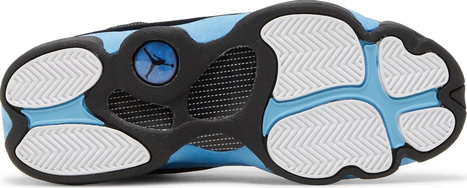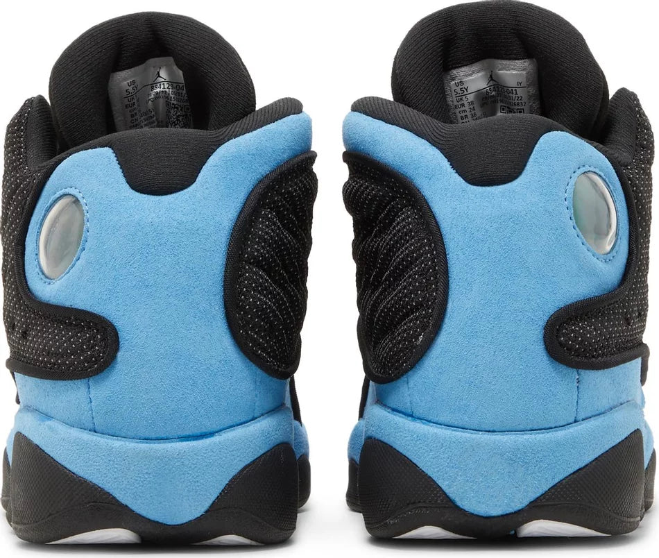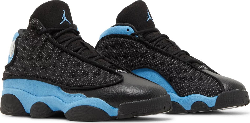 The Air Jordan 13 Retro GS Black University Bluefeatures Carolina-inspired accents on the silhouette that takes its design cues from Michael Jordans Black Catpersona. The mixed-material upper features black tumbled leather throughout the forefoot, a pair of black mesh overlays shot through with reflective detailing, and suede paneling in an energetic blue finish. The shoes predatory feline theme continues with a holographic badge signifying a cats eye and a herringbone-traction outsole modeled after a panthers paw.