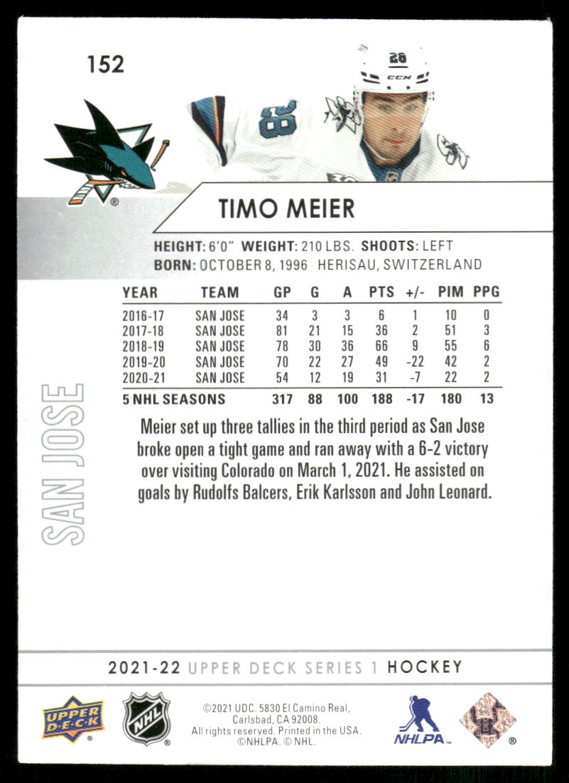 This is a nice example of a 2021-22 Upper Deck #152 Timo Meier